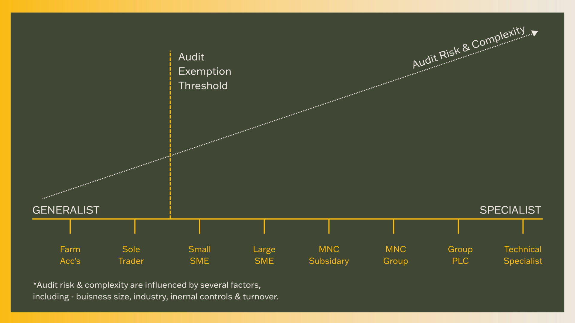 For the purposes of transparency, let’s categorise the audit landscape into two categories based on client base – Generalist and Specialist.