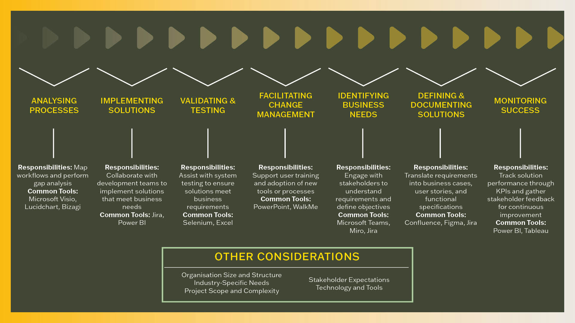 Business Analysts handle a broad range of activities across various stages. Below is an overview of their key responsibilities and the common tools used at each stage:
