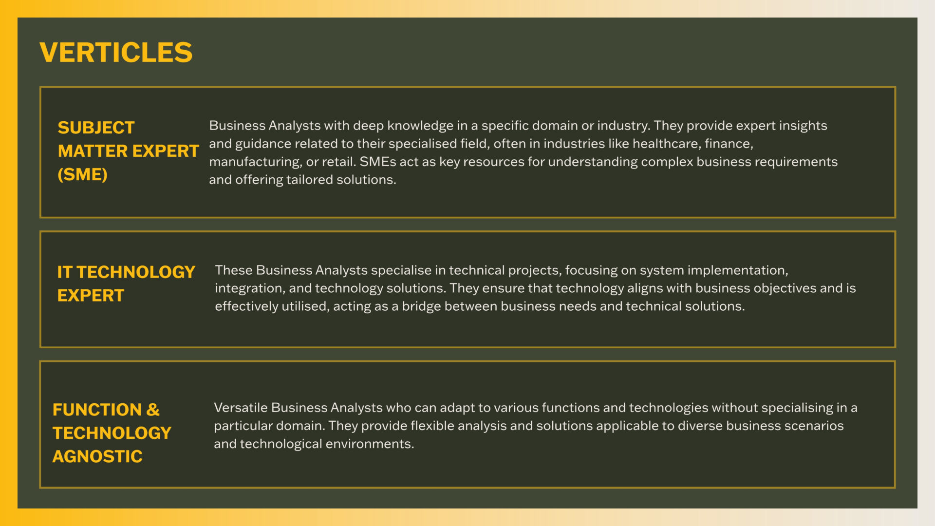 For Business Analyst professionals, verticals can be defined based on specialisation, industry focus, and the types of projects they work on. Defining these verticals allows Business Analysts to align their job search with roles that match their expertise and career aspirations. It also provides a clear framework for career development, particularly for those interested in diversifying across verticals. At Barden, we define the following key verticals: