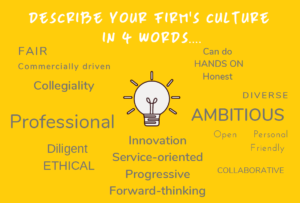 In our survey we asked leaders to “describe your firm’s culture in 4 words” …pretty tricky thing to do…here’s what they said: