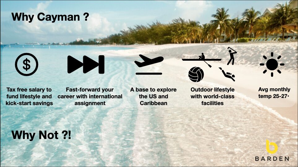 Is it hard to settle in? 100’s of professionals from Ireland and the UK have called Cayman home over the decades – some even went for a few years but never came home. On the ground, you’ll find a thriving, welcoming community of people that will go out of their way to help you get settled, meet people and make the most of what Cayman has to offer.