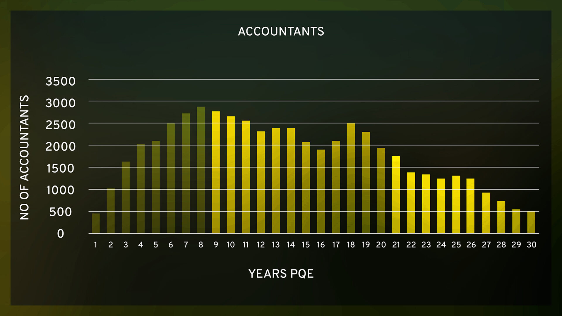 The graph above shows the distribution of qualified accountants in Ireland by years’ qualified.