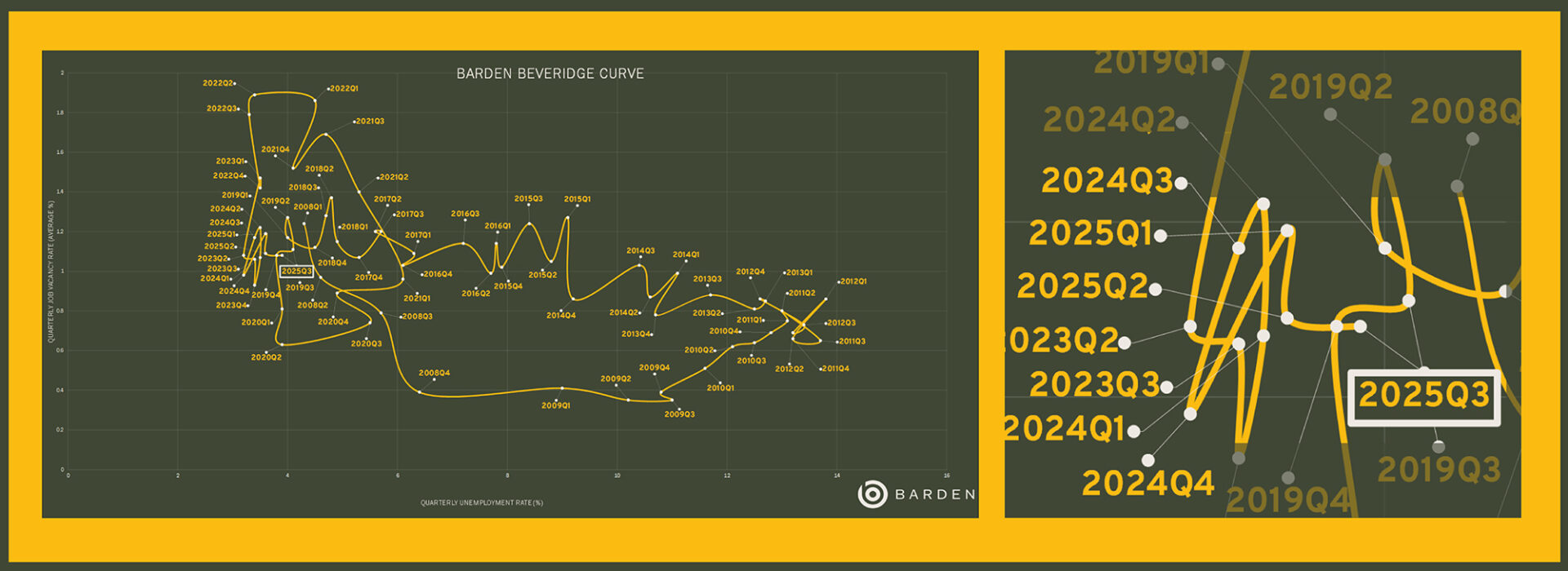 The Barden Beveridge Curve is an indicator of employment activity and talent demand in the market. It plots job vacancy rates against unemployment levels, with movements to the top left indicating higher demand for talent and movements to the bottom right indicating lower demand.