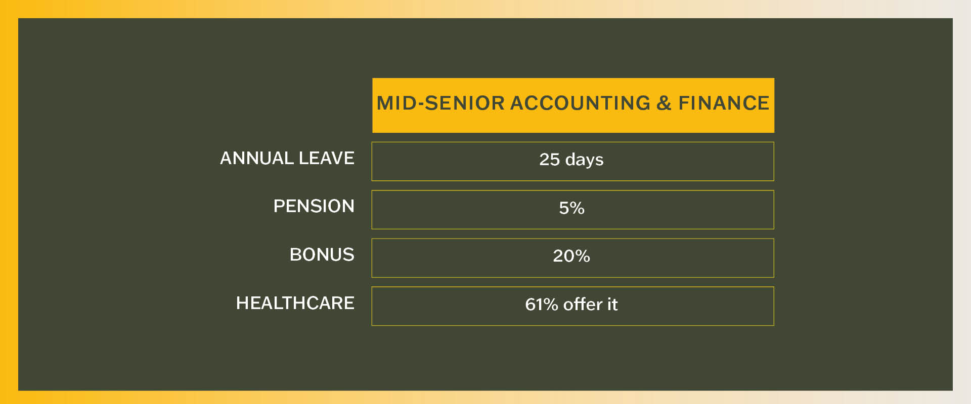 The graph below outlines the mode for benefits offered based on a sample of roles the mid-senior accounting & finance team in Barden supported in 2025.