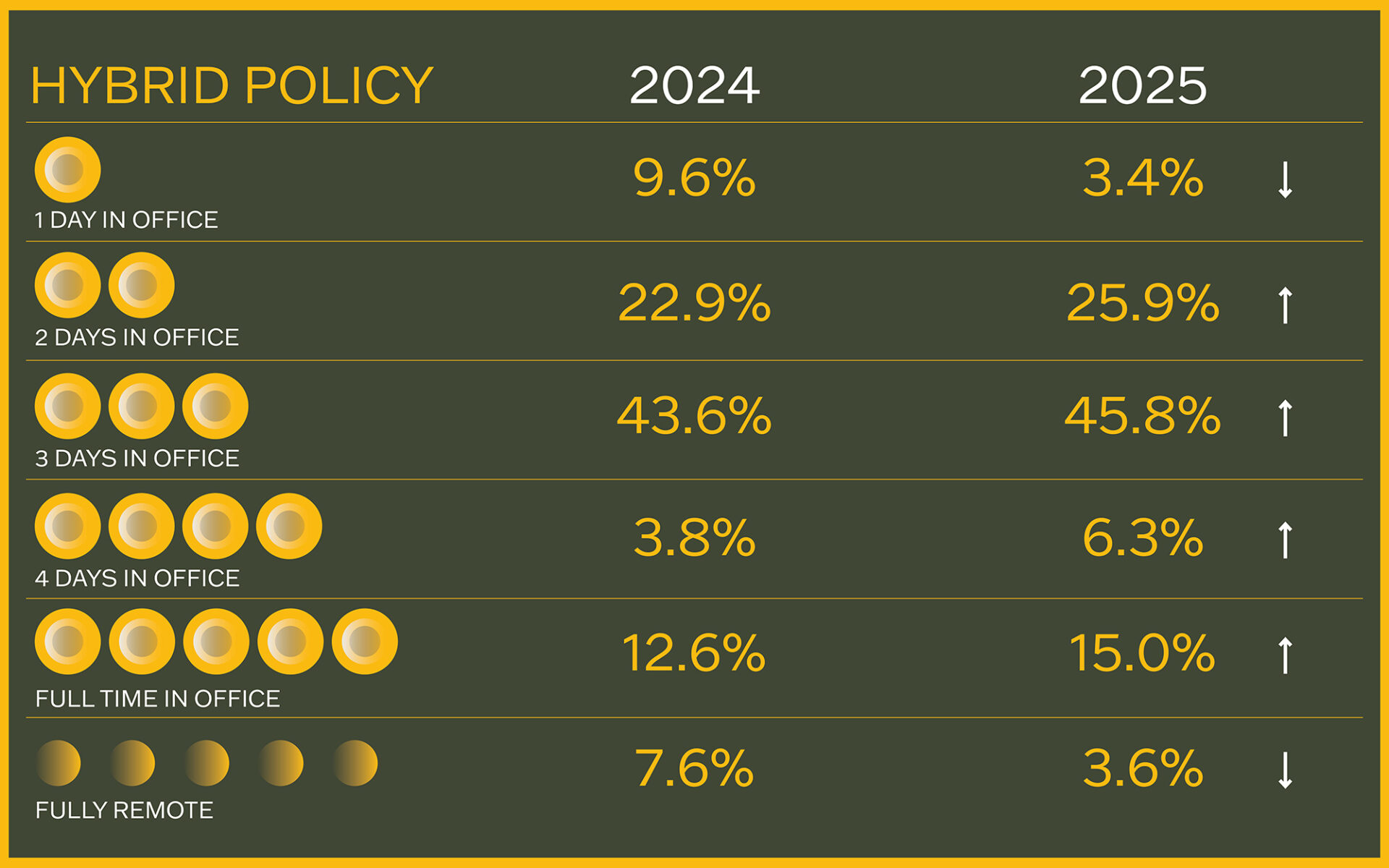 1) Companies that can genuinely offer fully remote roles retain a clear competitive advantage, while talent seeking fully remote work will face a very limited set of options. Many professionals currently working fully remotely are doing so largely due to legacy post-pandemic arrangements rather than new role availability.