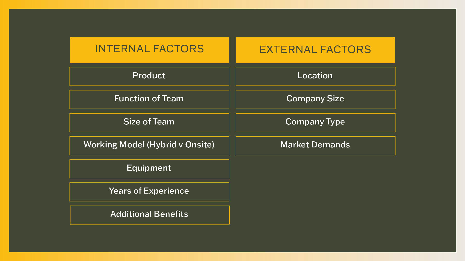 As mentioned above, salaries are influenced by multiple factors. We have divided these factors into 2 subsections – Internal and external factors
