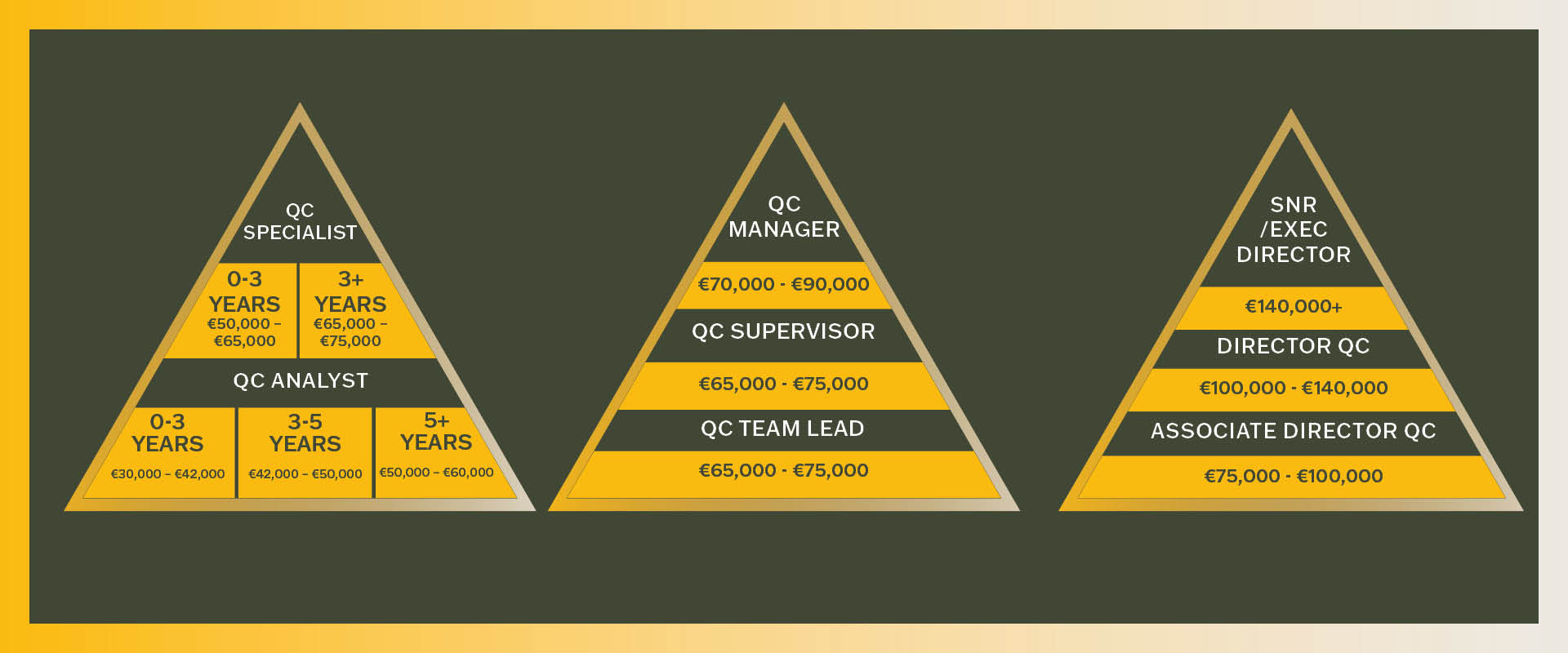 While the above captures in a simplistic way the nature of activities in QC, it’s important to note that roles will differ from one another depending on additional variables, which affect roles and salaries, and are further detailed in the Salary section below.
