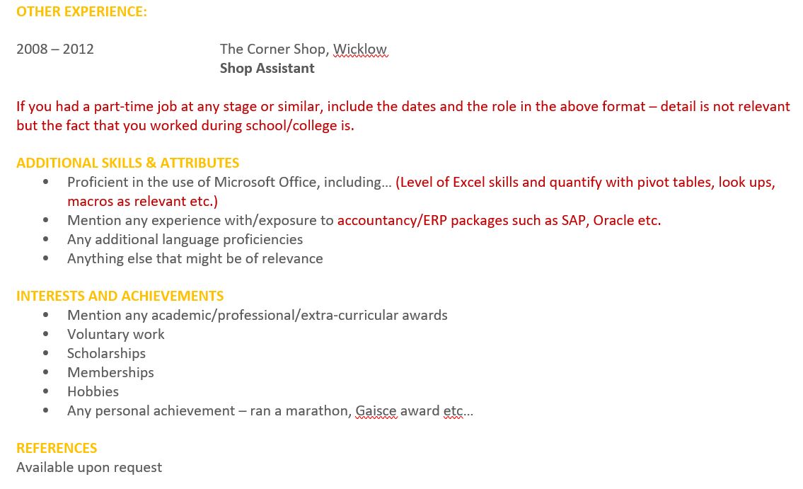 - Under achievements make sure you call out any project work or extra things that you are proud of – these should be short and speak to where you have gone above and beyond. Leave this out if you can’t point to anything of substance.