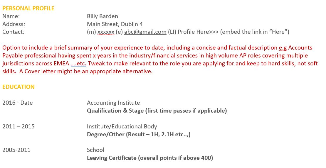 - Professional Summary: Tailor this to suit the job you are applying for. Make it specific. Make it a place where you can highlight your suitability for the role. Beware talking about soft skills here; they’re too subjective.