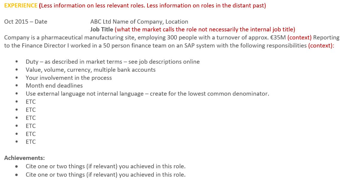- *Top Tip: People usually get interviews based on their current or most recent experience. You might be tempted to put in loads of detail about the job you had in 2012 but the reality is that is less relevant than the job you did last year. More detail for more recent roles; less (and maybe even just only dates, company and job title) for less recent roles. More detail for roles you spent more time in; less detail for roles you spent less time in. Follow these rules and you’ll be on the right track.