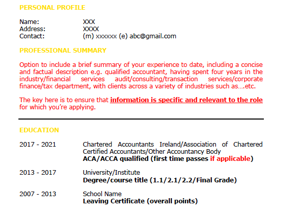 CVs are really simple in theory but can be very tricky in practice.  We’ve a lot of practice in Barden.  If you want an MS Word version of this CV template just drop an email to hello@stg.barden.ie and we’ll look after that for you. Easy.