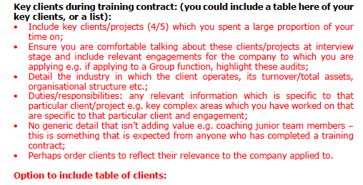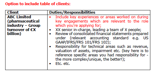 A great tip is to arrange your clients as relevant to the company you are applying to – applying to an Irish Plc?  Put your Irish Plc clients first on the list.  Simple.