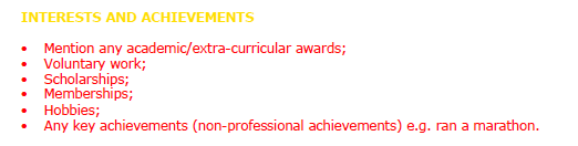 Step 3:  The other stuff:  The decision to interview you or not will likely already be made by the time the hiring manager gets to this point in your CV.  That said it is a great place to talk to you the person rather than just you the professional, can provide great information to break the ice at interviews and you might well be surprised at how much weight some hiring managers can put on non-work activities and achievements.  If you do it right it might look like: