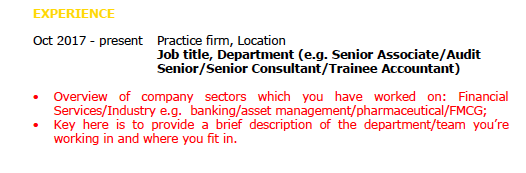 Finally, it’s definitely worth including examples of clients and details on any secondments. Don’t worry about using client names – anything that is in the public record you can feel free to reference. Make sure you give some context too – nature of organisational structure (Group vs BU), scale of business, nature of industry etc..). That stuff really counts.