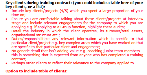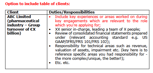 A great tip is to arrange your clients as relevant to the company you are applying to – applying to an Irish Plc? Put your Irish Plc clients first on the list. Simple.