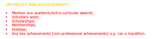 Step 3: The other stuff: The decision to interview you or not will likely already be made by the time the hiring manager gets to this point in your CV. That said it is a great place to talk to you the person rather than just you the professional, can provide great information to break the ice at interviews and you might well be surprised at how much weight some hiring managers can put on non-work activities and achievements. If you do it right it might look like: