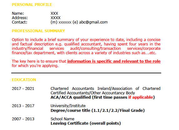 - Professional Summary: Tailor this to suit the job you are applying for. Make it specific. Make it a place where you can highlight your suitability for the role. Beware talking about soft skills here; they’re too subjective.