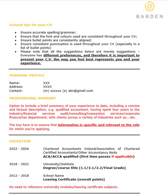 CVs are really simple in theory but can be very tricky in practice.  We’ve a lot of practice in Barden.  If you want an MS Word version of this CV template just drop an email to hello@stg.barden.ie and one of our team will connect with you.