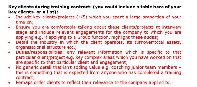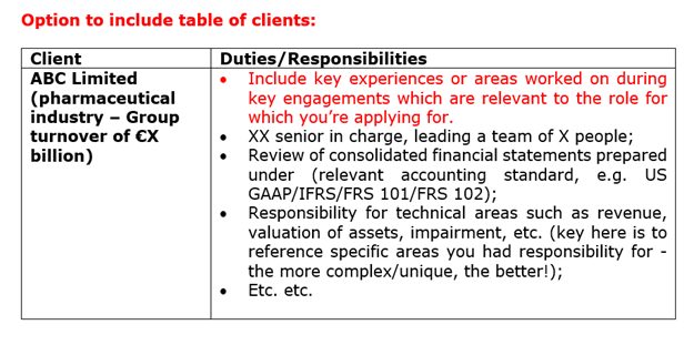 A great tip is to arrange your clients as relevant to the company you are applying to – applying to an Irish Plc?  Put your Irish Plc clients first on the list.  Simple.