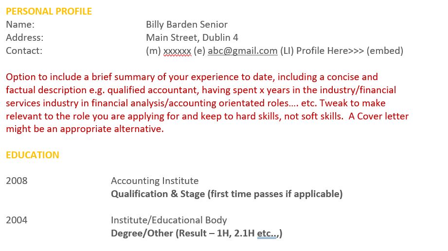CVs are really simple in theory but can be very tricky in practice. We’ve a lot of practice in Barden. If you want an MS Word version of this CV template just drop an email to hello@stg.barden.ie and we’ll look after that for you. Easy.