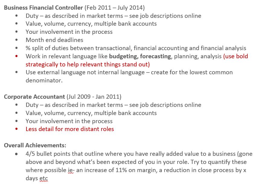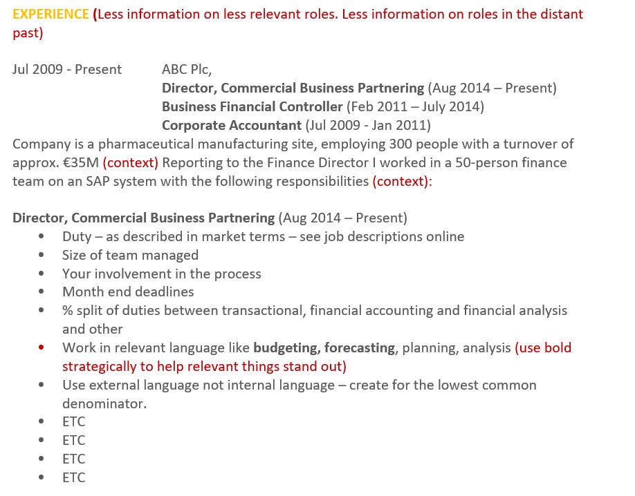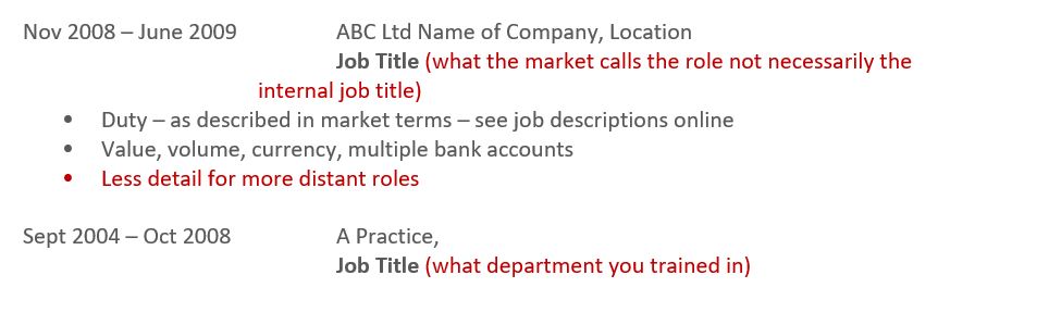 - Not everyone (in fact hardly anyone!) outside your current company will know anything about your current company. This is where the intro line above is key. It’s your chance to give context and to explain what ABC Ltd is and the structure you sit in, team size, reporting lines (just as important as what you do!)